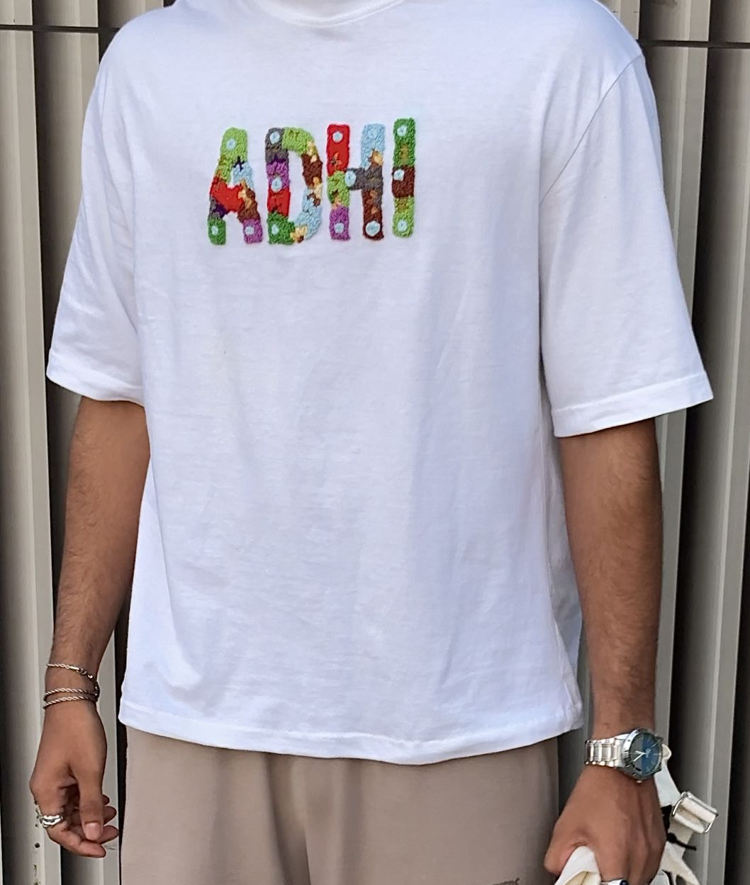 Personalize your tee with hand-embroidered text — whether it’s your name, a phrase, a mantra, or something uniquely yours. Each letter is meticulously stitched with colorful floral embroidery, blending traditional craftsmanship with a minimal, modern silhouette.